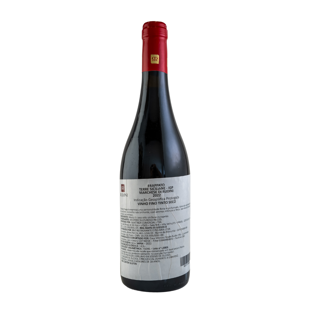 Uva Frappato “Vermelho rubi brilhante, com delicados tons de roxo. Aroma fresco e envolvente com delicados toques de frutas florais e vermelhas. Macio, equilibrado, com uma acidez viva, final aveludado, longo e persistente”.